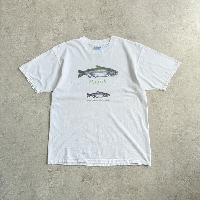 90s Go Fish Co.Ltd. Trout " My fish My husband's fish " Printed T-shirt