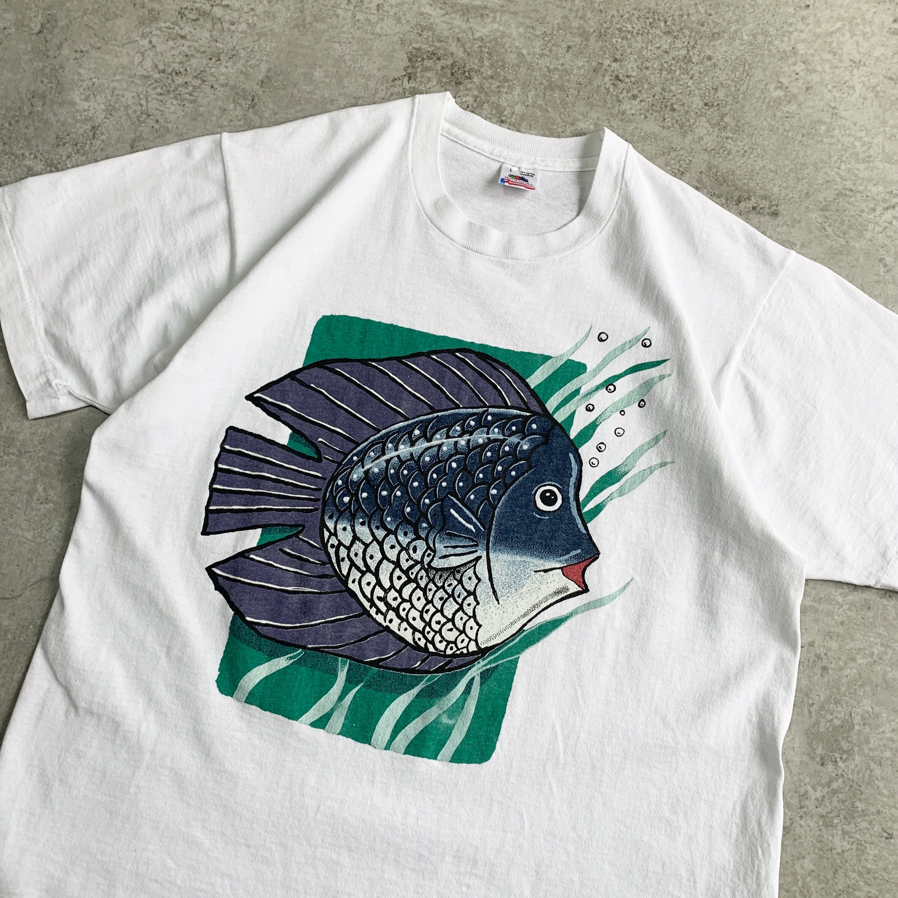 90s USA製 FRUIT OF THE ROOM Fish Printed T-shirt