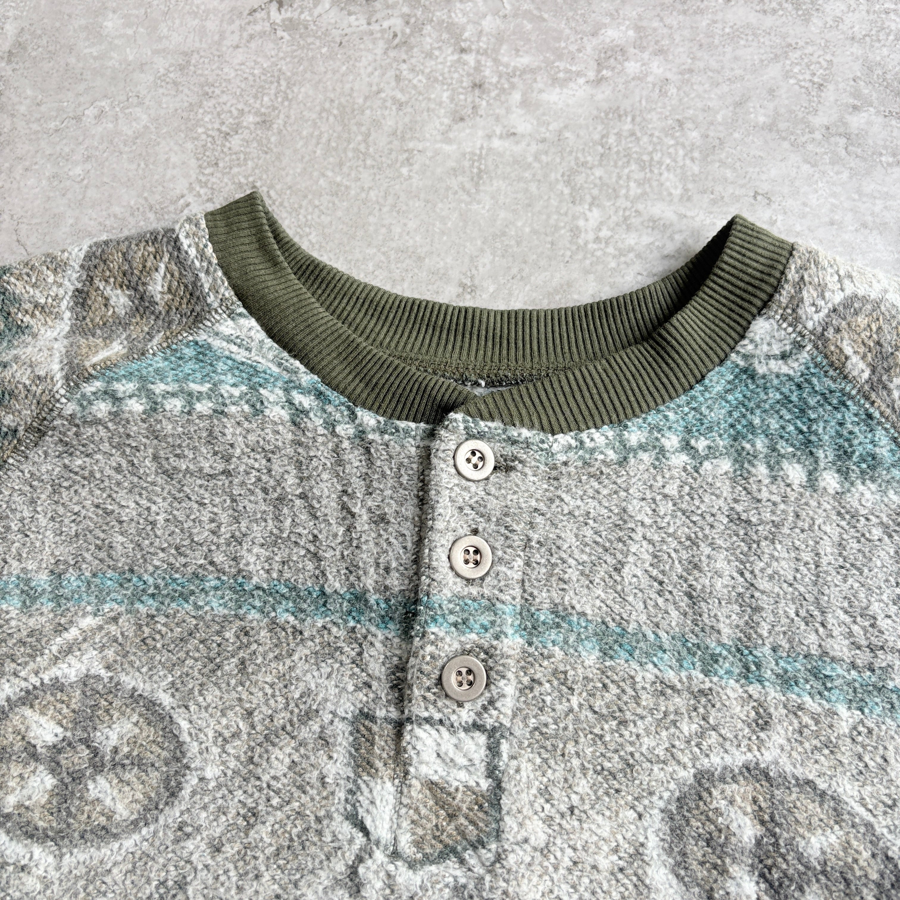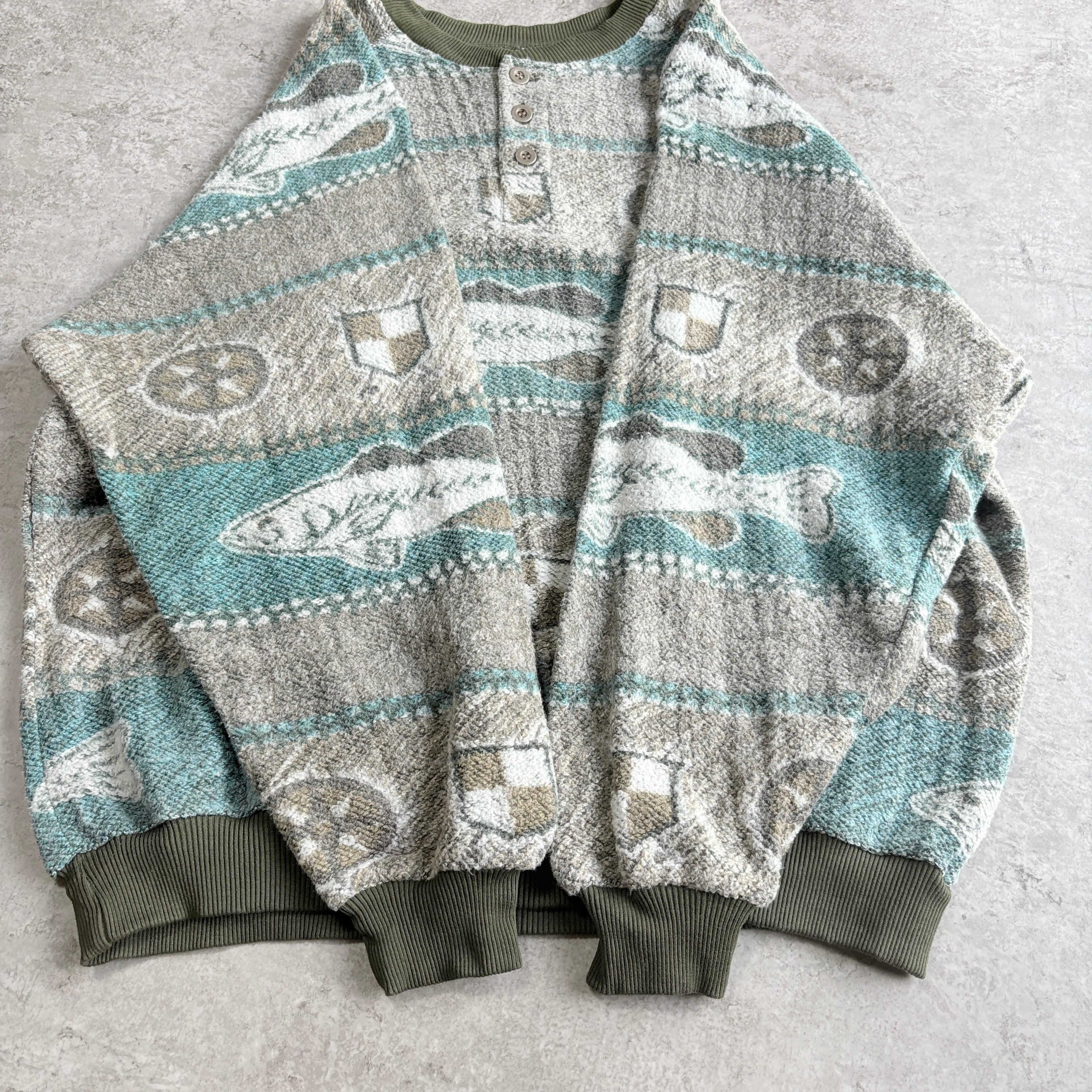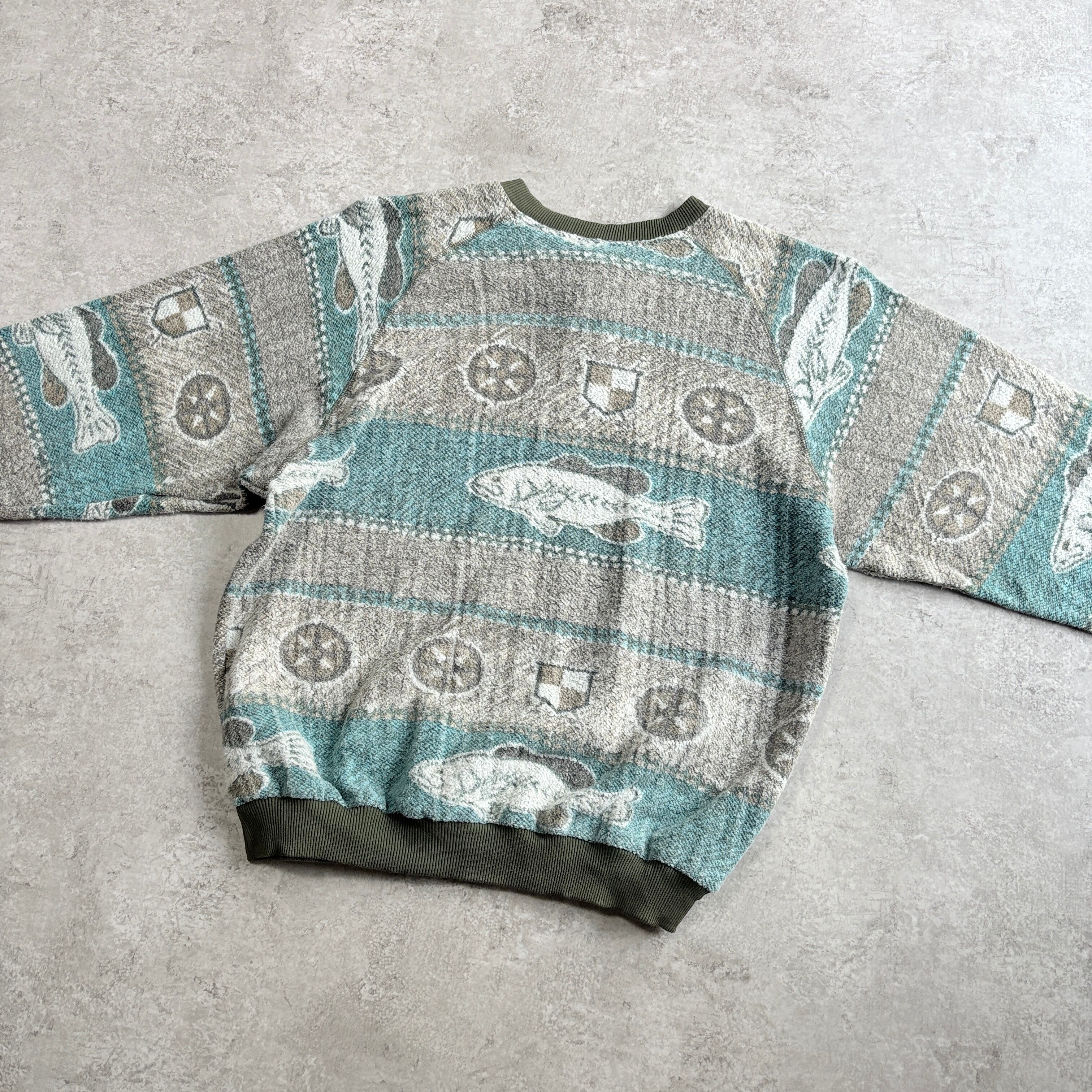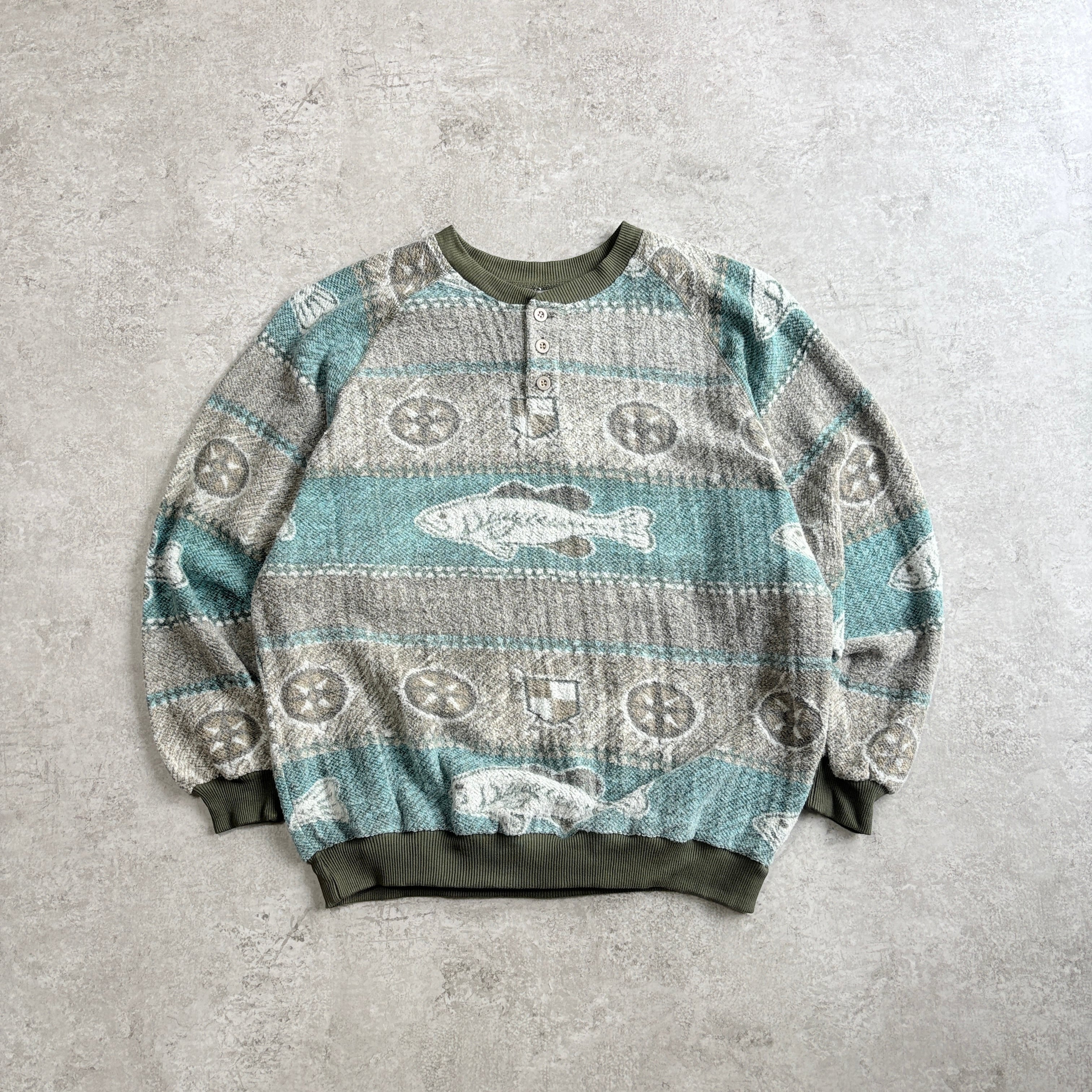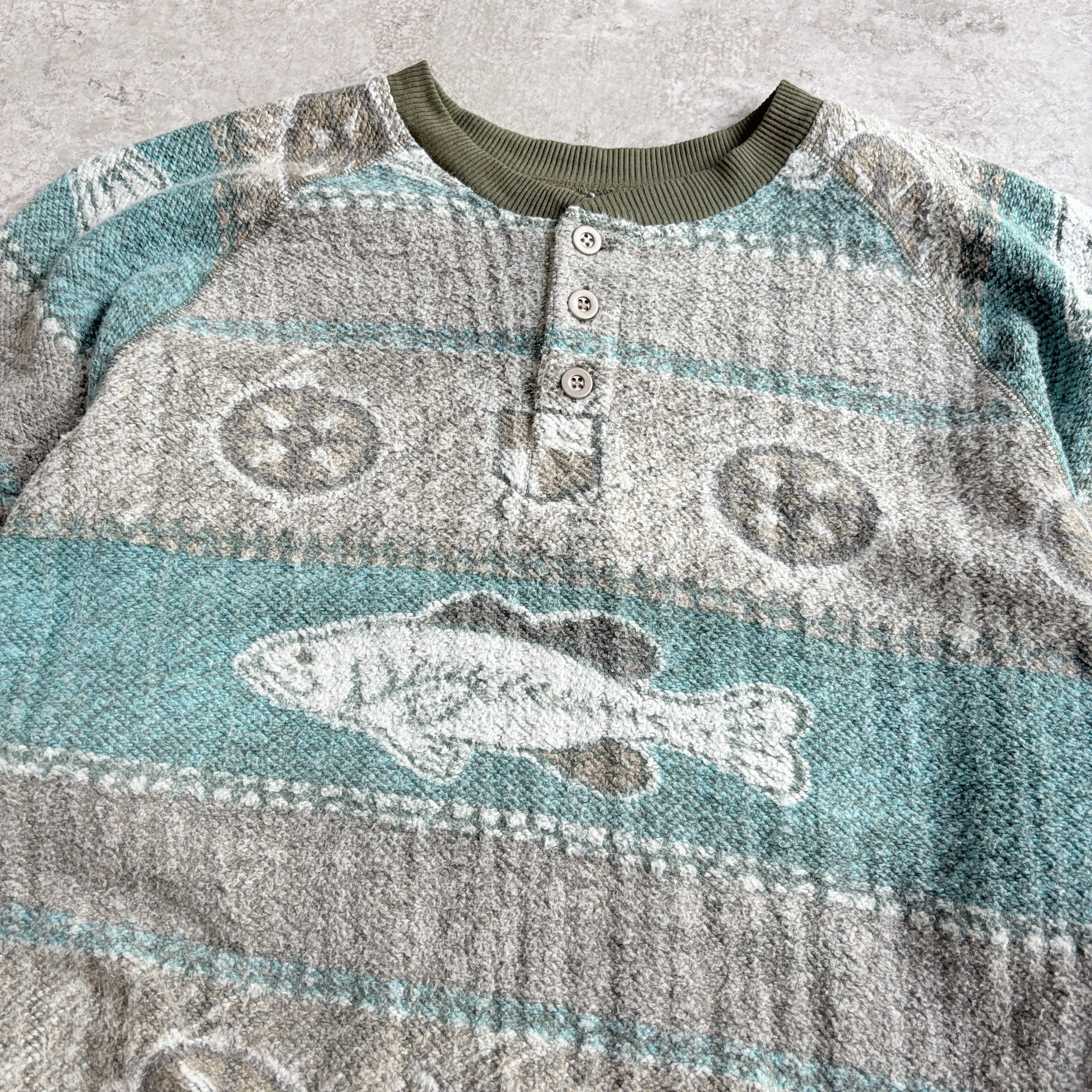 90s ブルーウォーターウェア ブラックバス 総柄 ハーフボタン スウェット 魚 起毛